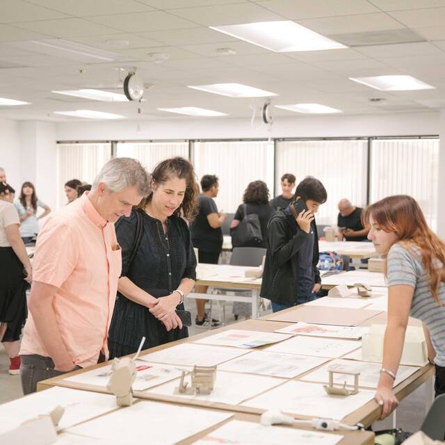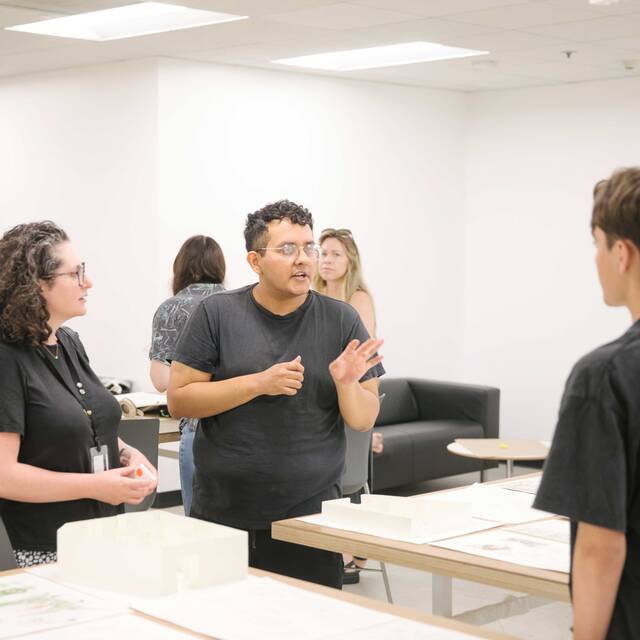 High school students collaborating on art and design projects in a bright, hands-on classroom at ArtCenter.